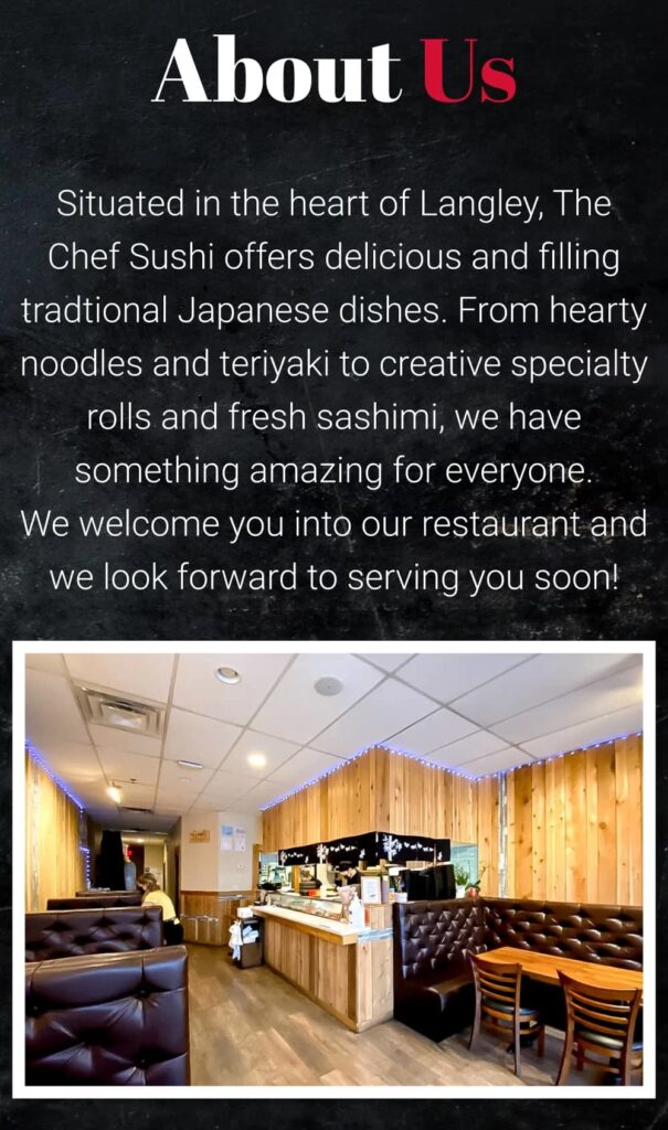 En el corazón de Langley, Columbia Británica, se encuentra Chef Sushi, un destino culinario que ha capturado la atención de los amantes de la comida japonesa y coreana. Este establecimiento se ha consolidado como un lugar de referencia para quienes buscan una experiencia gastronómica auténtica y diversa. Desde sus inicios, Chef Sushi ha prometido un menú que va más allá de lo convencional, ofreciendo una amplia gama de opciones que satisfacen tanto a los paladares tradicionales como a aquellos que buscan nuevas y emocionantes combinaciones de sabores. Prepárate para un recorrido detallado por lo que este popular restaurante tiene para ofrecer, así como un vistazo a su evolución y lo que los comensales pueden esperar al visitarlo.