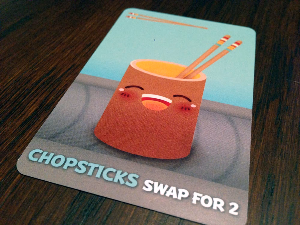 Here’s how it works: The player chooses the first card they would like from their hand as usual. Before everyone else reveals their cards, the player calls out “Sushi Go!” and takes a second card from their hand, also placing it face-down on the table. Then all players reveal the cards they have chosen.