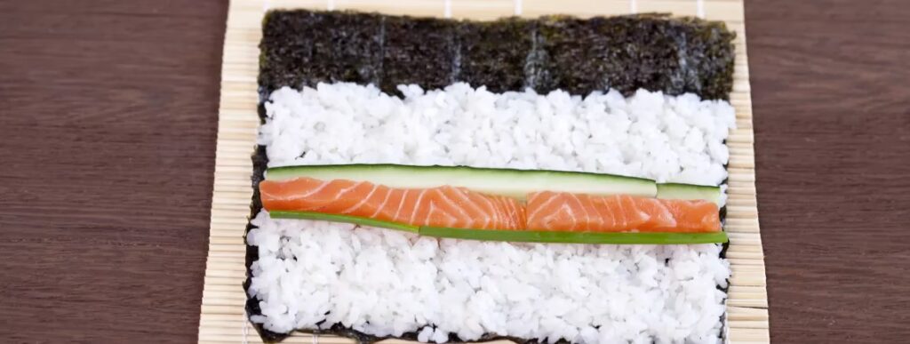- Enrollar el maki: Con los dedos, sujeta firmemente las garnituras. Usando la esterilla de bambú, levanta el borde inferior del nori y el arroz, y comienza a enrollar hacia adelante, haciendo presión firme y uniforme para que el rollo quede bien compacto. Es importante que el rollo esté apretado para que no se desarme al cortarlo.