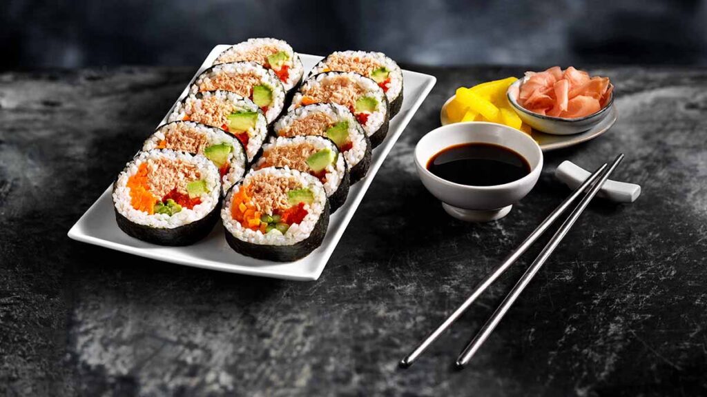 - Sushi: La salsa de soya y el sushi son, sin duda, un matrimonio inseparable. Mojar ligeramente una pieza de sushi o sashimi en salsa de soya complementa el sabor suave del pescado crudo y el arroz, añadiendo un contraste salado que realza la experiencia gustativa. Recuerda mojar solo el lado del pescado, no el arroz, para evitar que se desarme.
