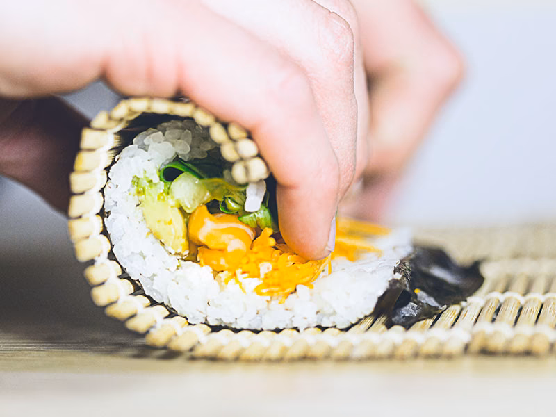 - Enrollado: Sujeta la parte trasera de la esterilla con los pulgares, y con los dedos, presiona el relleno para que no se mueva. Junta los dos bordes de arroz (superior e inferior) y aprieta bien para formar un cilindro compacto. Hazlo rodar un poco para terminar de darle forma y, por último, humedece el borde libre del alga para que se pegue y el rollo se mantenga firme.