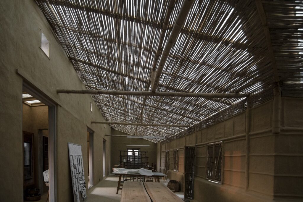 La distribución de los espacios refleja una consideración profunda por los artesanos. Los tejedores, en su mayoría hombres, se sientan en sus telares en el área central, abundantemente iluminada por el cielo. Las mujeres, que se dedican a tejer, coser y hilar, utilizan cómodamente un espacio de trabajo elevado. Un elemento distintivo es el estudio de Chiaki Maki, una estructura independiente construida con marcos de bambú, enlucida con barro mezclado con estiércol y cubierta por un techo transparente con un enrejado de bambú. Este espacio, que evoca una elocuente casa de tierra, está diseñado específicamente para su uso personal, donde desarrolla los diseños antes de que los tejedores los transformen en exquisitas telas.