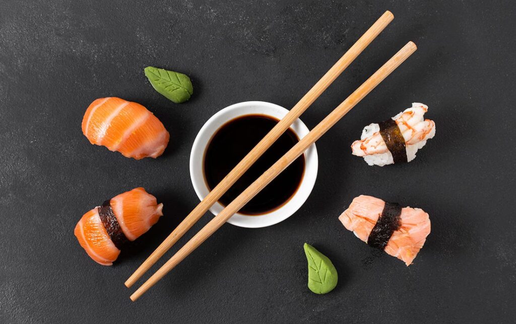 - Sushi y Salsa de Soja: Al mojar el sushi en salsa de soja, solo moja ligeramente la parte del pescado, no el arroz, para evitar que el arroz se desmorone y absorba demasiada sal.