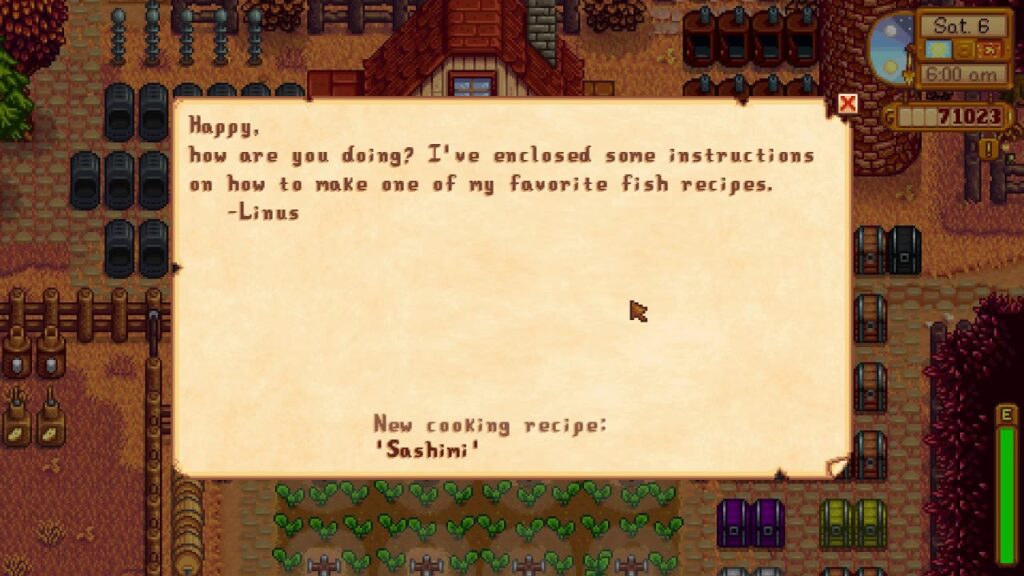 Para empezar a preparar Sashimi, primero necesitarás la receta. Afortunadamente, esta se consigue de una de las maneras más sencillas en Stardew Valley: a través de la amistad. El humilde y sabio Linus, el ermitaño que reside en su tienda en La Montaña, es la clave para desbloquear este conocimiento culinario. Cuando tu nivel de amistad con Linus alcance al menos tres corazones, te enviará la receta de Sashimi por correo. Aumentar tu nivel de amistad con los habitantes de Pelican Town es una parte fundamental del juego y se logra principalmente a través de la interacción diaria y la entrega de regalos que les gusten. Linus, en particular, aprecia los regalos sencillos y naturales como el Níspero, el Batata Silvestre o las Bayas de Salmón, aunque cualquier regalo que le guste contribuirá a fortalecer vuestro vínculo. Una vez que recibas la carta con la receta, esta se añadirá automáticamente a tu colección de habilidades culinarias, lista para ser utilizada.