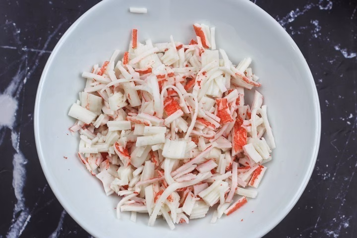 1. Descongela y desmenuza las barritas de cangrejo en trozos pequeños.