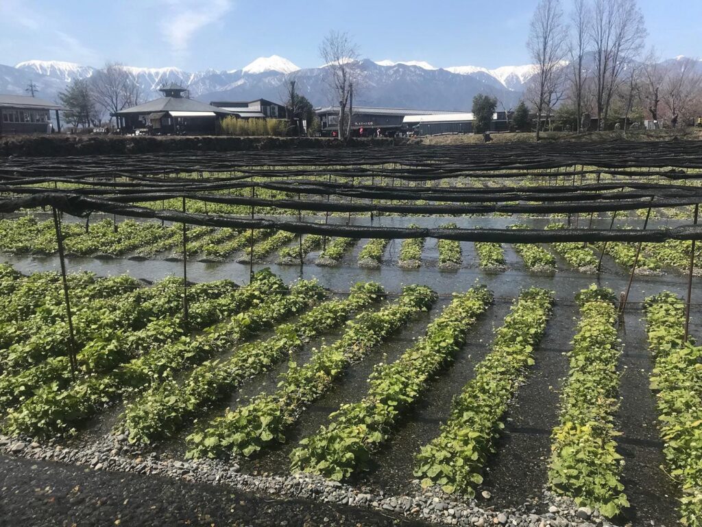 The farm has multiple large fields with a meticulously maintained network of small streams that constantly provides each wasabi plant with clear, flowing water from the Northern Alps. Only under such pristine conditions is wasabi cultivation possible. From May to October, the fields are protected from the sun by black tarp sheets.